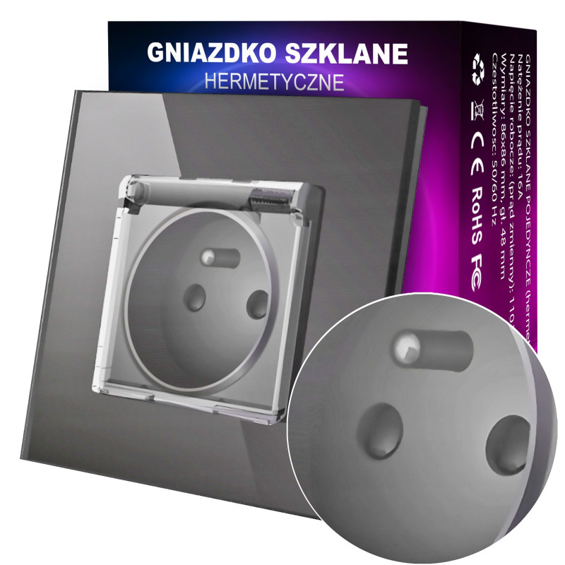 Prezentujemy najwyższej jakości hermetyczne szklane gniazdko z klapką z panelem ze szkła hartowanego o grubości 4mm, uziemieniem oraz zabezpieczeniem torów prądowych przed dostępem dzieci.