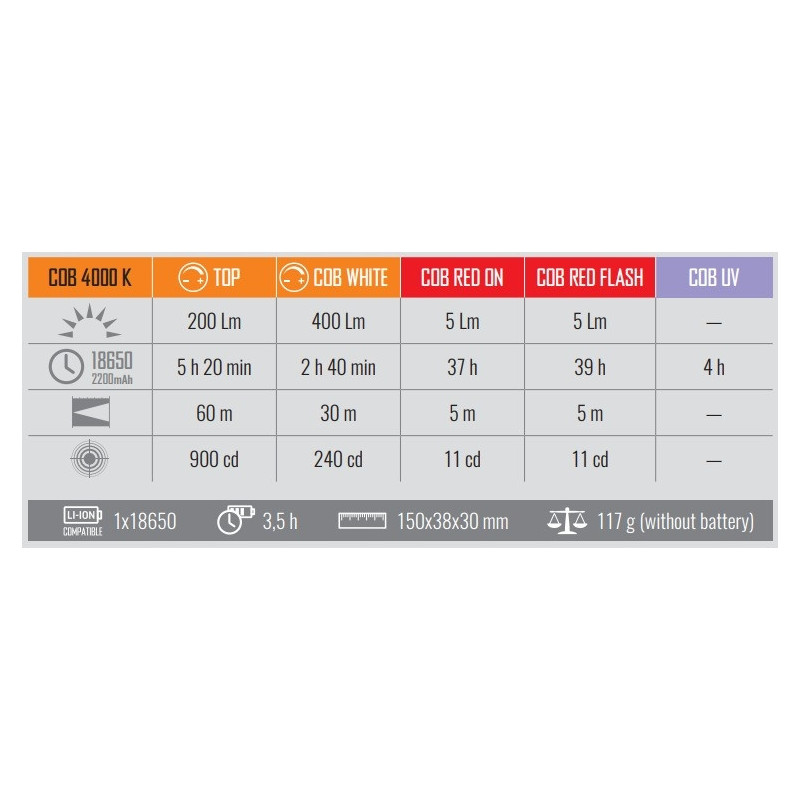 ▪ Tryby pracy: 5 (Top, COB White, COB Red ON, COB Red Flash, COB UV)