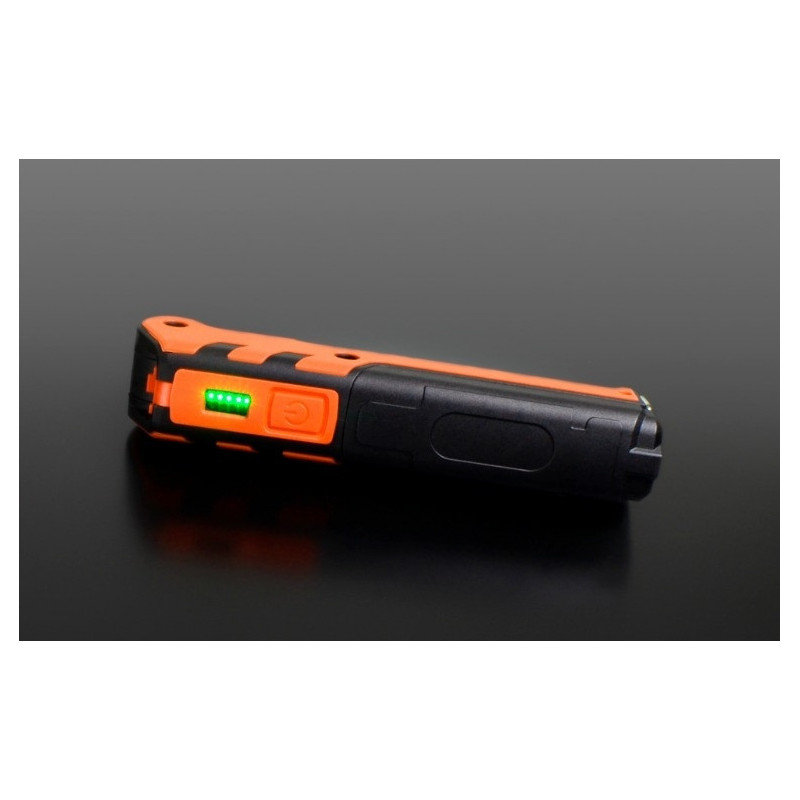 Wskaźnik LED na przycisku informuje o poziomie naładowania latarki: