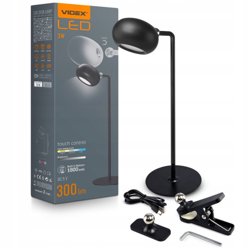 Lampa stołowa LED na akumulator VIDEX VL-TF18W 3W zapewnia jasne i przyjemne oświetlenie. Dzięki mocy 3W i strumieniowi świetlnemu 300Lm jest energooszczędna i trwała, zapewniając znaczną oszczędność energii. Jedną z cech tej lampy jest możliwość regulacji temperatury światła w różnych zakresach. Możesz zmieniać barwę światła pomiędzy ciepłą i chłodną bielą, aby stworzyć idealną atmosferę do pracy, nauki lub relaksu. Dla ułatwienia użytkowania lampy w zestawie znajdują się także dodatkowe elementy mocujące umożliwiające różnorodne mocowanie lampy na półce, stole lub dowolnej płaskiej powierzchni za pomocą konsoli magnetycznej na samoprzylepnej podstawie. Cechą szczególną tej lampy jest przycisk dotykowy do sterowania.