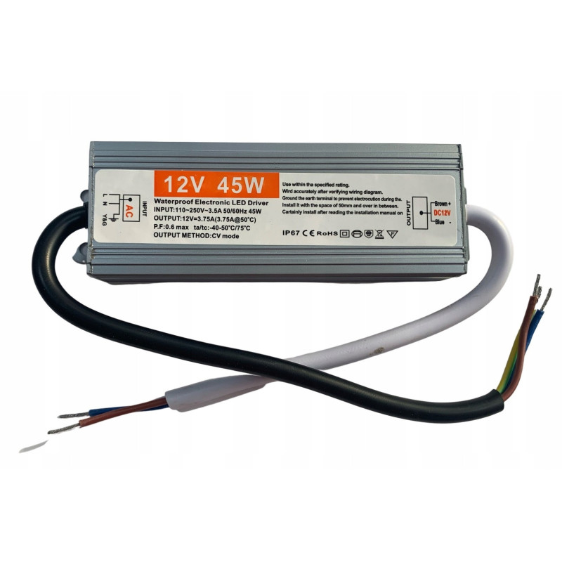 Wysokowydajny, wodoodporny, charakteryzujący się stabilną pracą zasilacz o mocy 45W i napięciu wyjściowym 12V/3,75A. Przeznaczony do zasilania oświetlenia LED w szczególności taśm LED. Montażowy, nadający się do instalacji w łazienkach dzięki wysokiej odporności na wilgoć (certyfikat IP67).