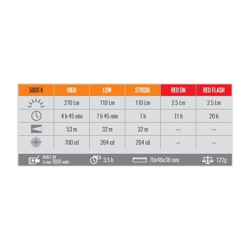 Czołówka z focusem, który pozwala na regulację średnicy i intensywności wiązki światła. Opakowana została w trwałą i wodoodporną obudowę polimerową. Generuje dodatkowe jasne czerwone światło, które nie zakłóca widzenia w nocy i posiada czujnik ruchu do włączania gestem.
