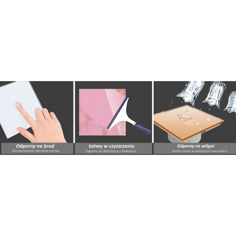 Połączenie designu i wygody daje nam produkt odporny na brud, wilgoć, stuknięcia. Nie odkształca się, ani nie blaknie. Panel szklany łączony jest z wkładem dotykowym w którym umieszczone jest serce urządzenia, montaż przebiega w sposób bardzo prosty, jak w przypadku zwykłego osprzętu (włącznika światła mechanicznego i gniazdka elektrycznego). Sam panel posiada okrąg który jest podświetlony - podświetlenie ma za zadanie zwiększenie widoczności - tym samym nie jest ono mocne i nie będzie dla nas uciążliwe.